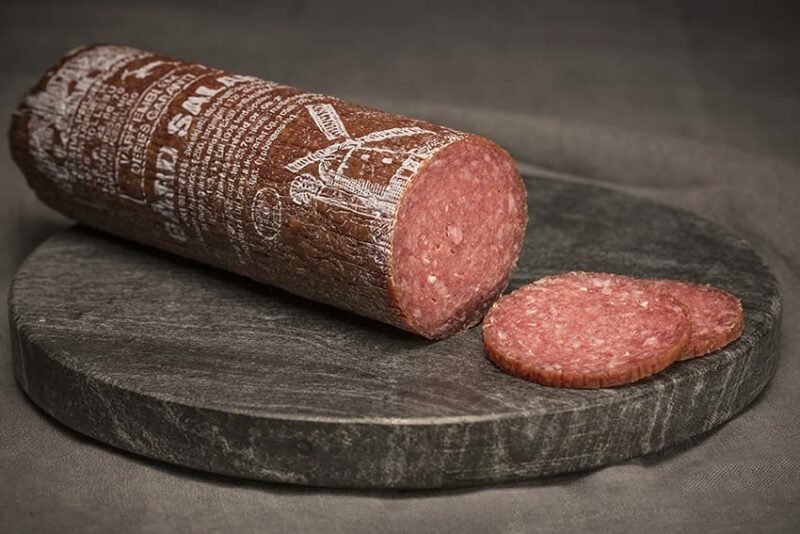 Ingredienser: Svinekjøtt, storfekjøtt, salt, krydder, hvitløk, konserveringsmiddel E250, fargestoff E120, stabilisator E525, surhetsregulerende middel E330, antioksidant E301 133g kjøtt til 100g ferdig pølse